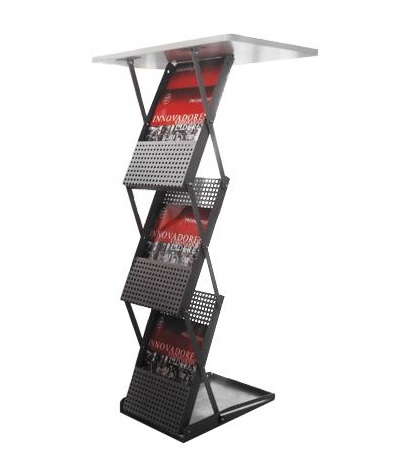 Portafolletero de acero plegable con mesa, para folletos tamaño carta.