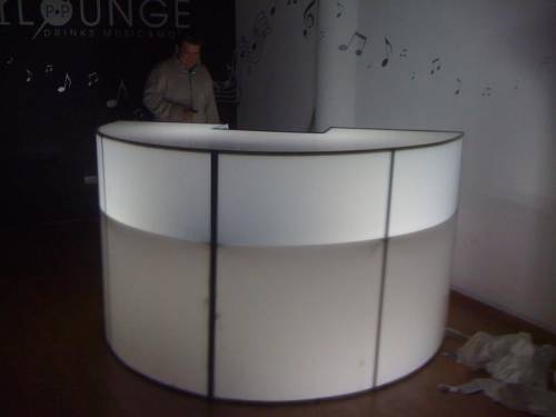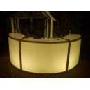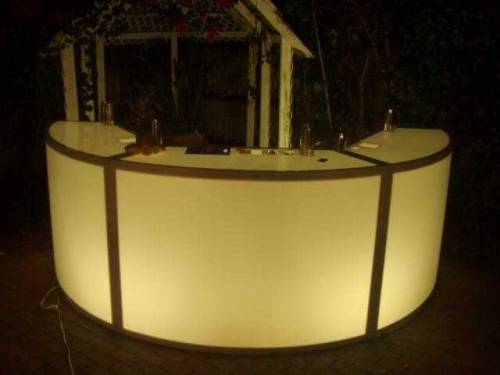 Barra Curva de Esructura de Acero, con Acrilico Blanco, con repisas, area para hielera al interior, ruedas para ser transportada y preparación para colocar sombrilla 2.7 m