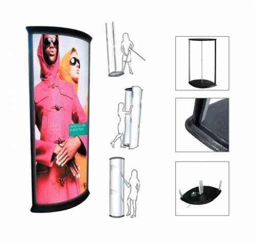 Pedestal de aluminio fijo de base oval, con sistema de iluminación interior para colocar gráficos en dos vistas con medidas de 86 cm x 2.0 m, pesa 1.8 kg, incluye maleta