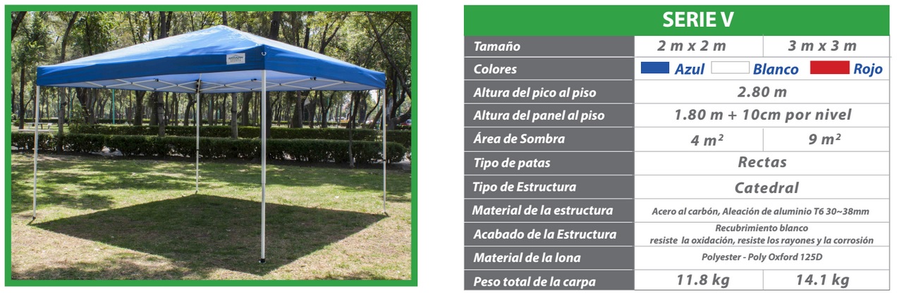 Acero al carbon, herrajes de aluminio, techo de 125d, poliester impermeable y proteccion de rayos UV