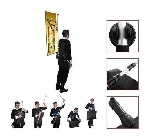 Display tipo mochila, de plástico rígido ligero forrada de polyester para exhibición de gráfico con opción de 1 o 2 vistas. Posee un tubo retráctil de aluminio para ajustar al largo del gráfico y compartimento interior para colocación de documentos. Fácil armado y cinturón ajustable. Incluye maleta transportadora de polyester.