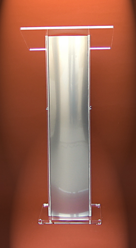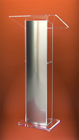 Podium fabricado en acrilico de alta calidad. Frontal en acrilico plata o blanco satinado. Amplia superficie en el frontal para personalizar. La mesa del podium tiene capacidad para un computador portatil