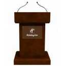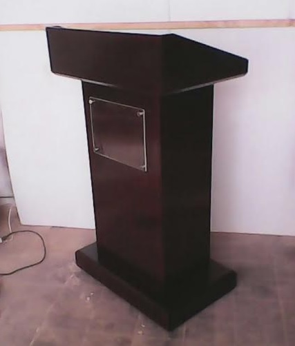 Podium con gran presencia, fabricado en maderas finas, repisas internas,   especial para hoteles, centros de convenciones, incluye acrilico frontal de 25 cm de altura x 40 cm con chapetones metalicos.