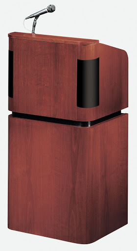 Podium para grandes eventos, presencia imponente, fabricado en caoba, con cajo interior, preparación para microfonos