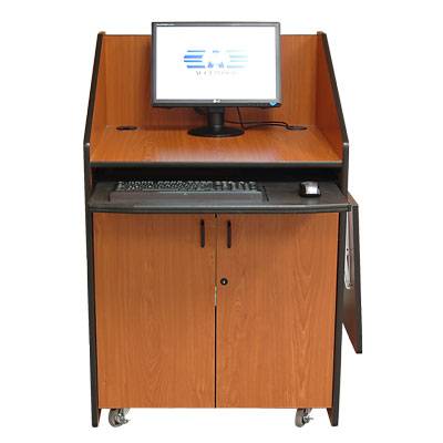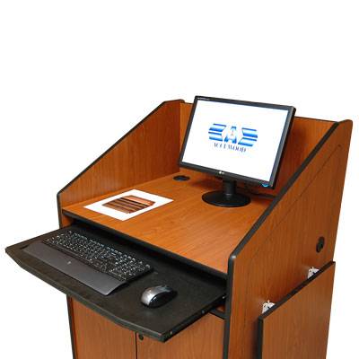 Este podium multimedia corporativo ofrece una gran combinación de privacidad y de la superficie de trabajo. Los laterales Altos ofrecen más privacidad para el presentador y menos distracción para el público durante la presentación.