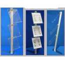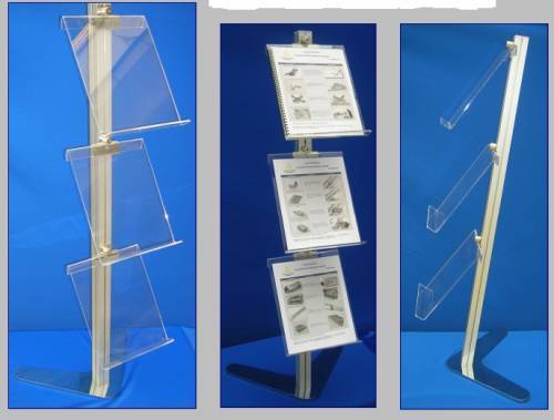 pulida y cromada en forma de bumerán y un poste de perfíl máxima de 40 mmanodizado natural con un ángulo de inclinación de 7° con su respectivatapa plástica, 3 porta charolas fabricadas en lámina cal. 16" troqueladay galvanizada así como 3 cabezas de martillo HQIL que son los que sostienen3 charolas de acrilico transparente de 4.5 mm de grueso.