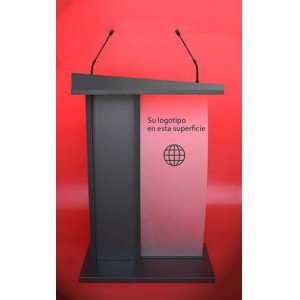 Podium para orador fabricado en madera chapeada color negro con capacidad apacidad para dos oradores. El Podium Córdoba ofrece una imagen dinámica y contundente con especial dedicación a la personalización