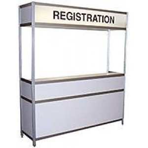 Modulos de registro muy elegante, para eventos de nivel donde los recepcionistas pueden estar sentados, y formar una herradura, con puerta con visagrasFabricado con Octanorm, trovicel o MDF